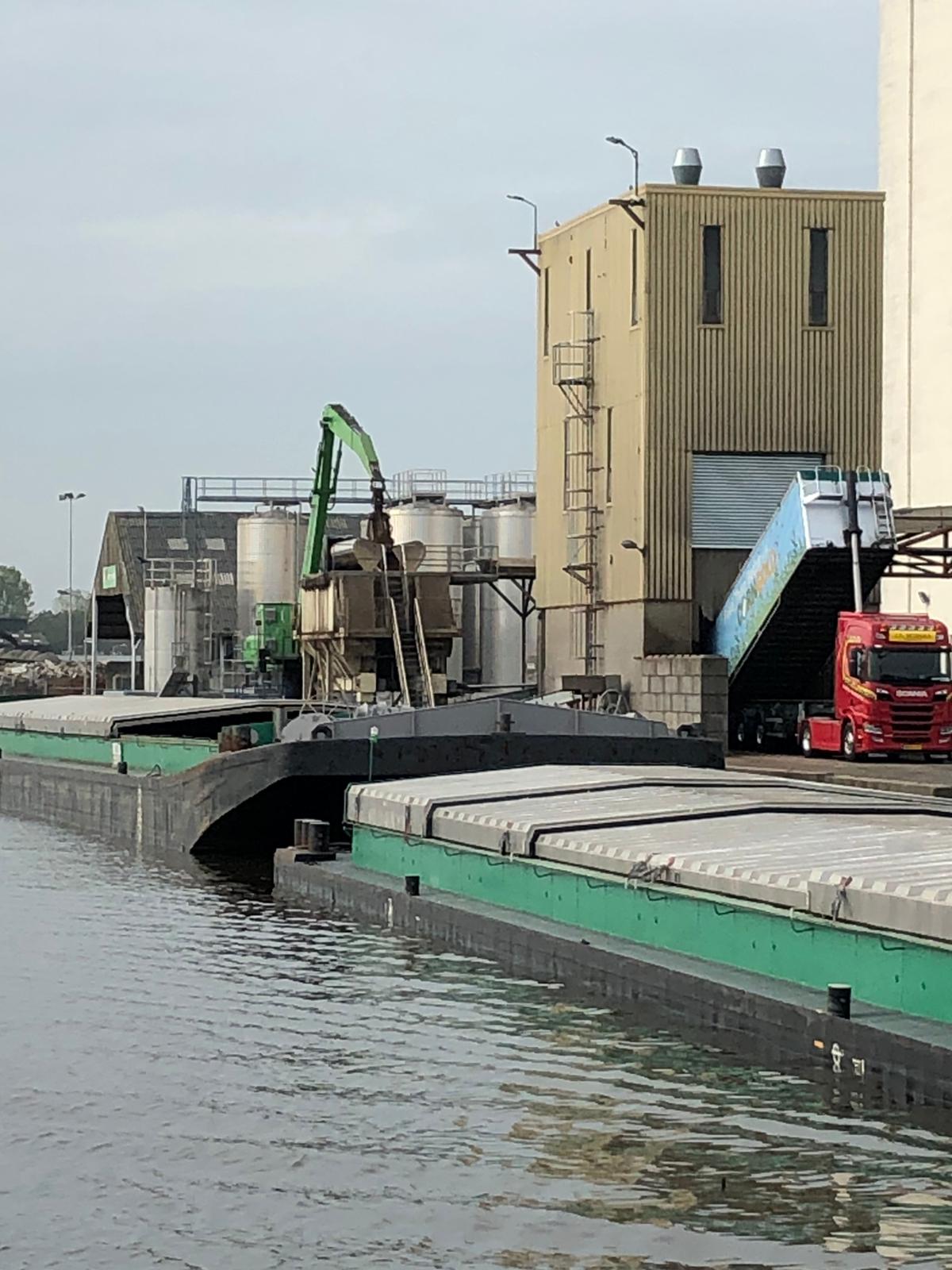 Foto: Een vrachtschip met grondstoffen wordt gelost met kraan bij veevoerbedrijf Agrifirm te Drachten.