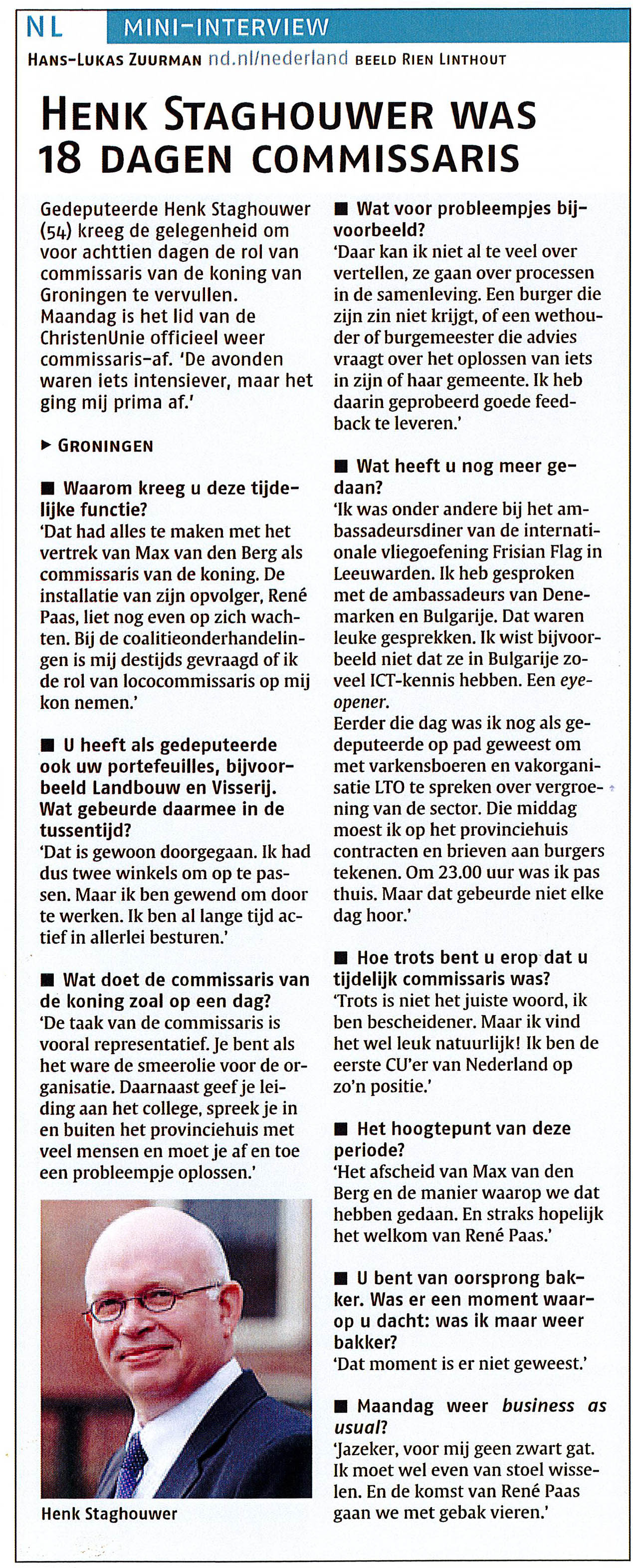 Het Nederlands Dagblad en RTVNoord spraken met Henk Staghouwer over zijn ervaringen als loco-commissaris. Lees het interview van het Nederlands Dagblad hieronder of beluister het interview van RTVNoord.